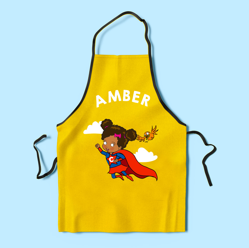Girls Superhero apron. Personalise with skin and hair colour. Personalise with your child’s name.