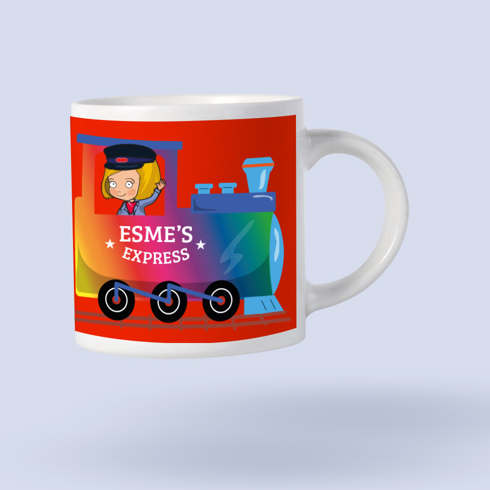 Girls Train Driver Mug. Personalise with skin and hair colour and name.