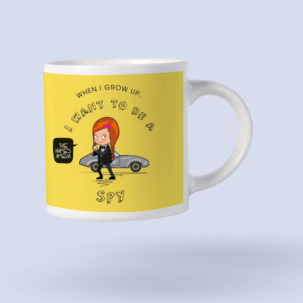 When I grow up… I want to be a Spy mug. Personalise with skin and hair colour and name.